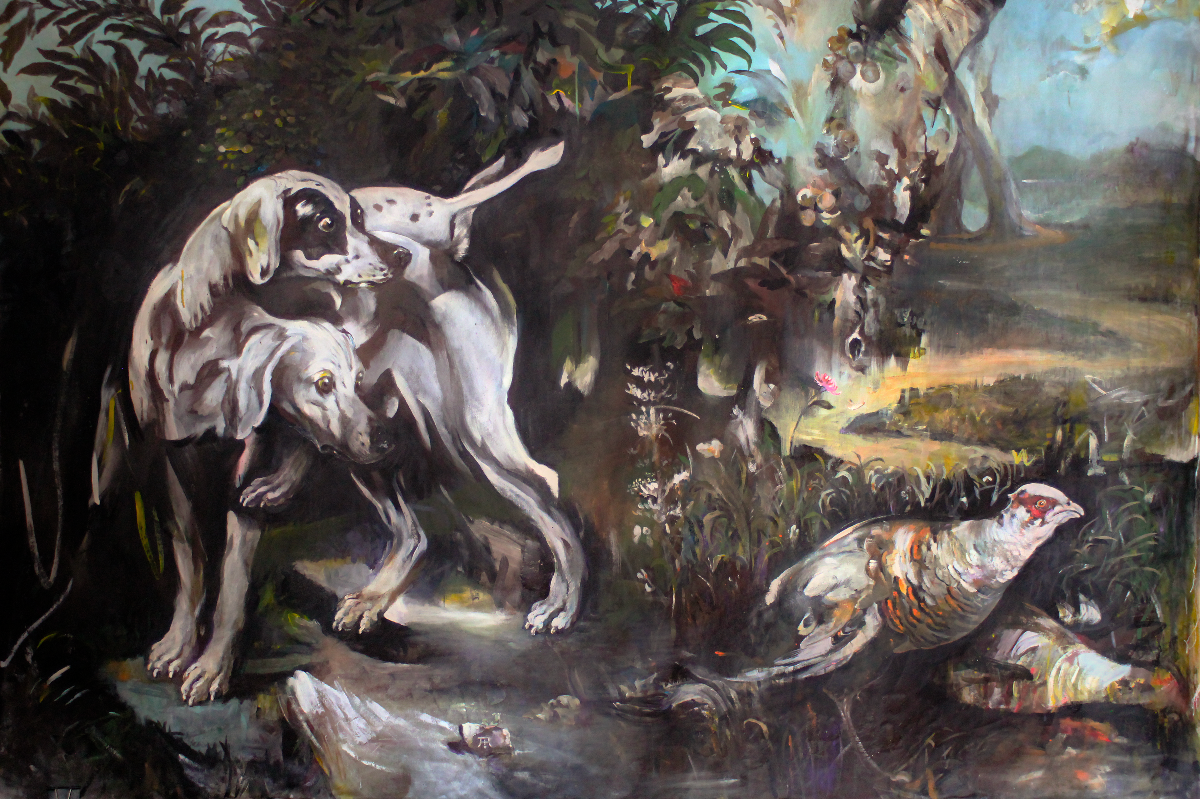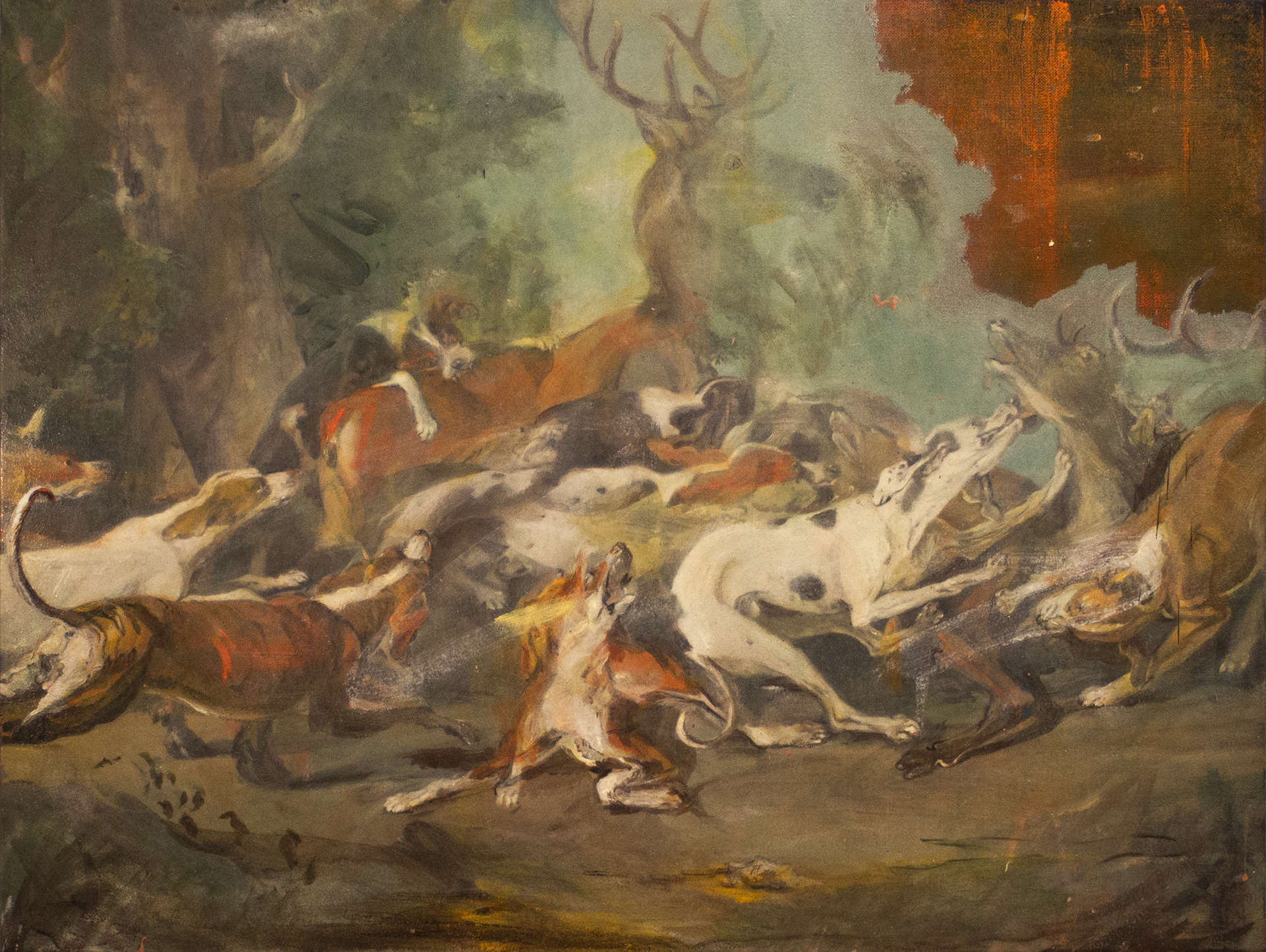 L’hallali et le débuché, 2025, acrylique sur toile trouvée, 50 x 65 cm