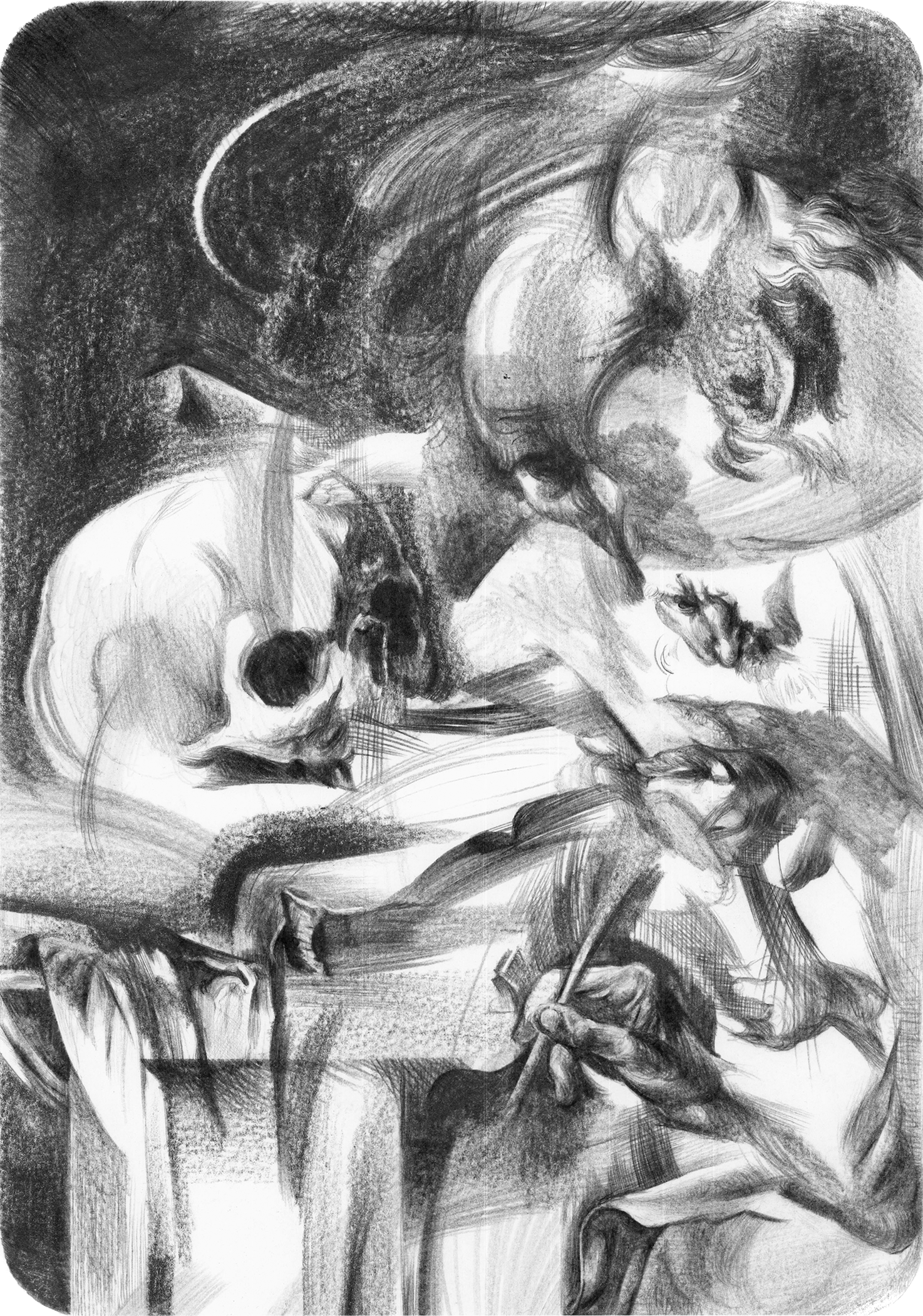 Saint Jérôme, d’après Caravage, 2021, graphite sur papier, 35 x 27 cm